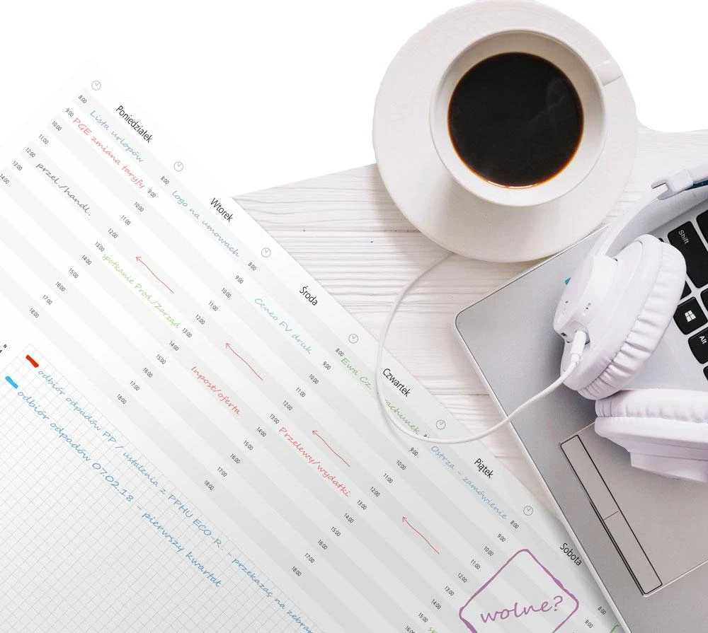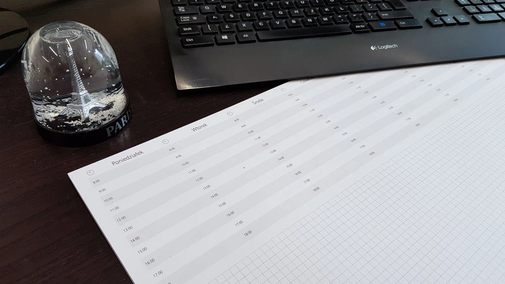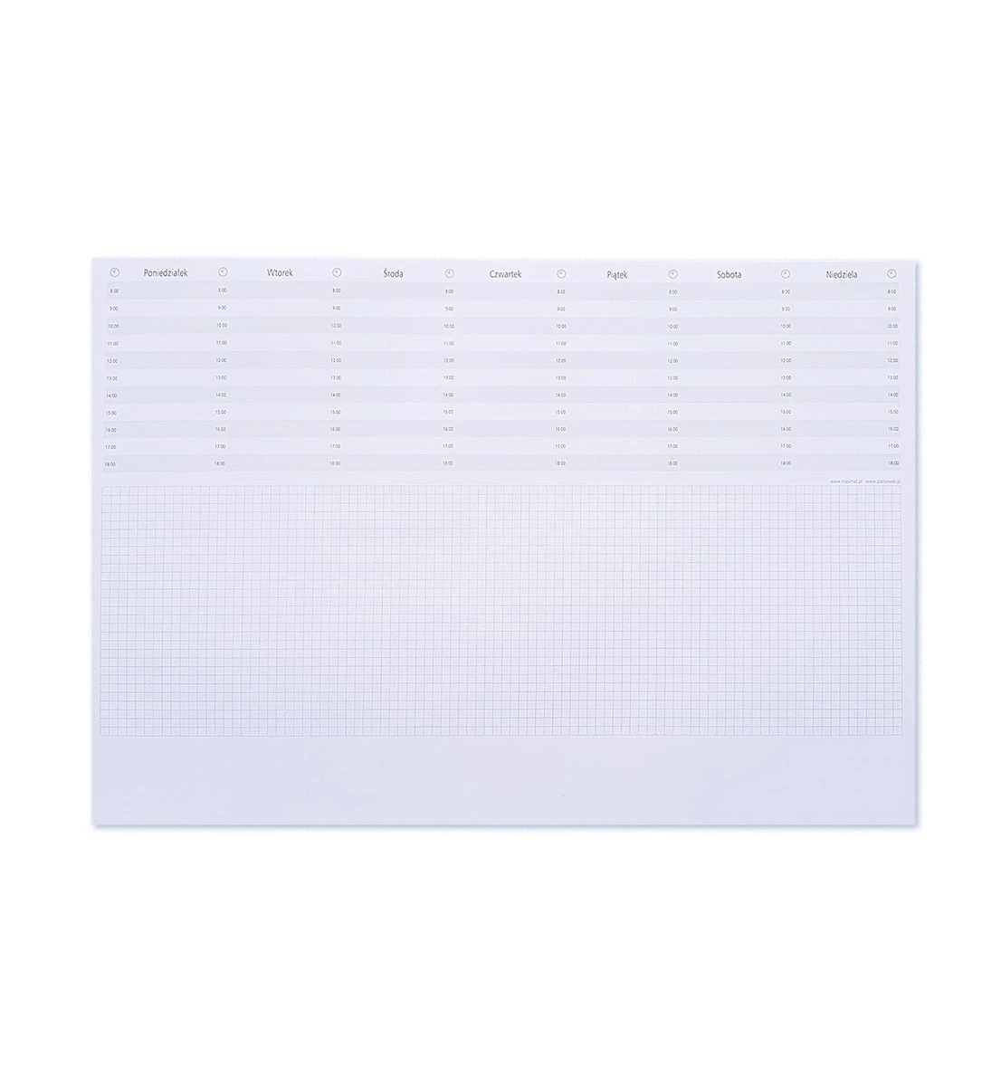 Przemyślany układ - na górze terminarz tygodniowy z miejscem na notatki (podział godzinowy), Obszerne pole w kratkę na dowolne zapiski i rysunki. Uniwersalny wymiar- notes/planer jest odpowiednio duży, żeby zrobić czytelne notatki i jednocześnie zmieści się na każdym biurku. Kolorystyka pasująca do każdego wystroju biura, czy domowej pracowni