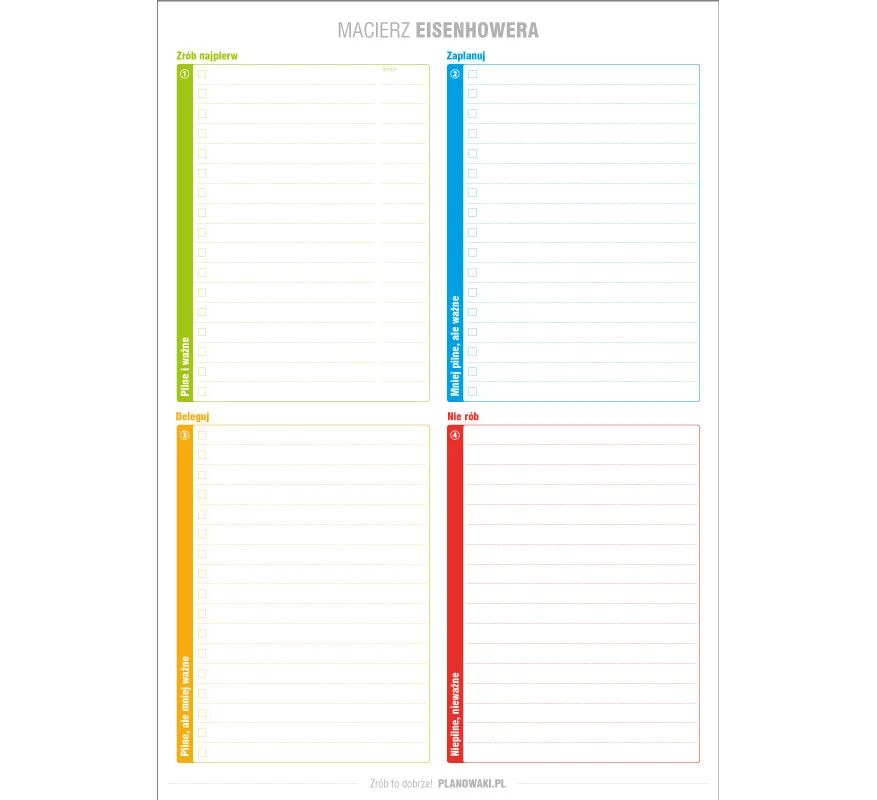 Jak widzisz, dla Twojej wygody macierz została już podzielona na kategorie, z których każda jest oznaczona odpowiednim kolorem. W ten sposób, po wypełnieniu planera, jeden rzut oka na macierz wystarczy, żebyś mógł zaplanować swoje obowiązki na dany dzień.