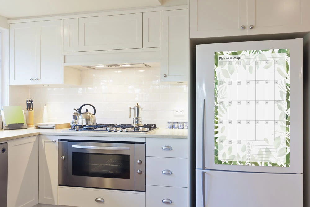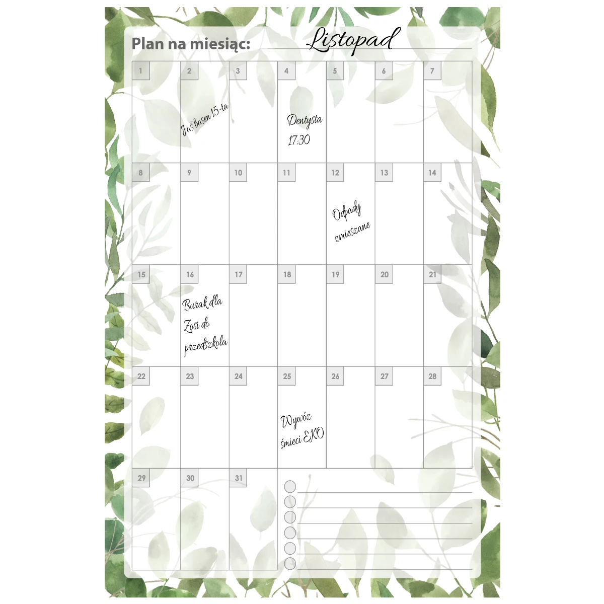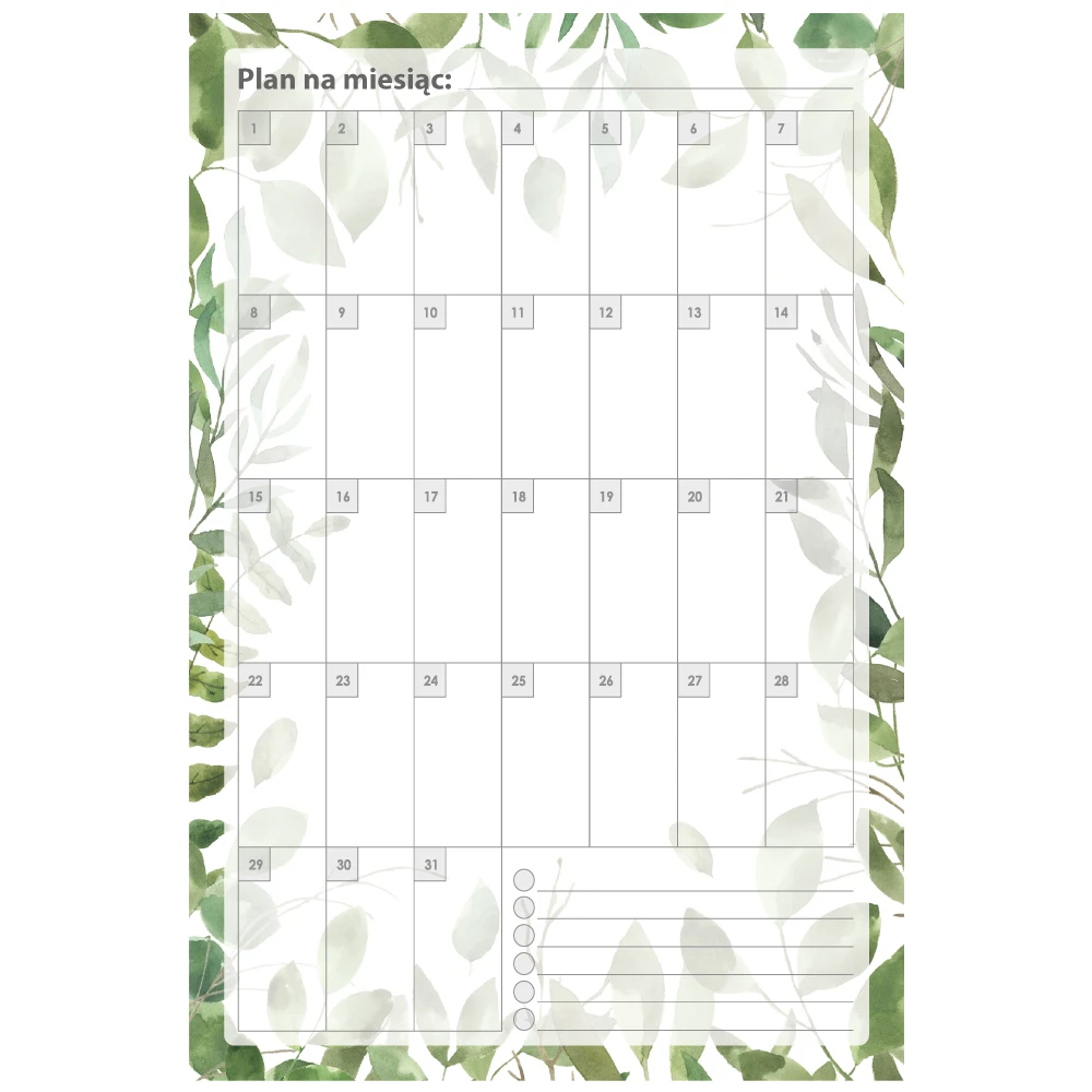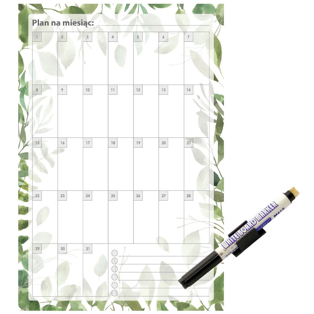 Planer suchościeralny ze wzorem roślinnym uniwersalny, na dowolny miesiąc format A2, GRATIS czarny marker ze ścierakiem