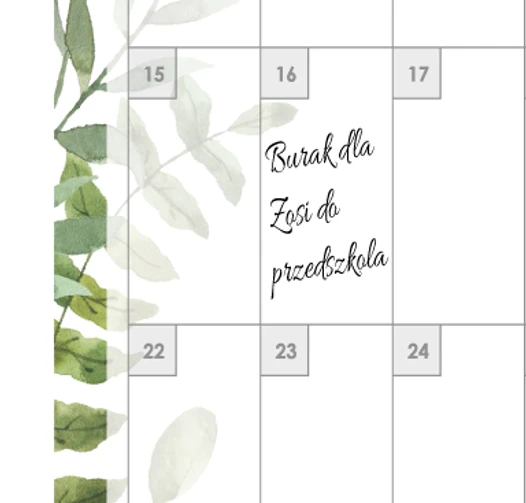Przydatny na codzień do planowaniaposiłków,, zajęć szkolnych, pozaszkolnych, wydarzeń domowych w tym nadchodzących imienin i urodzin, listy zakupów i in.