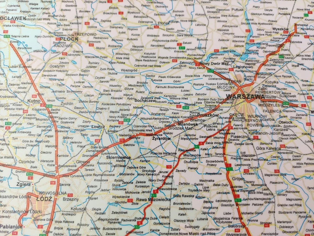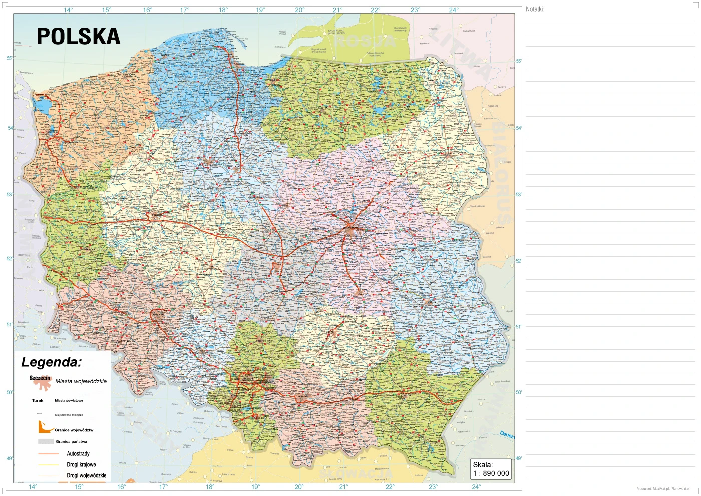granica państwa, podział na województwa, zielenie, drogi powiatowe, wojewódzkie, autostrady, kolej punkty miast z nazwami, rzeki, jeziora;