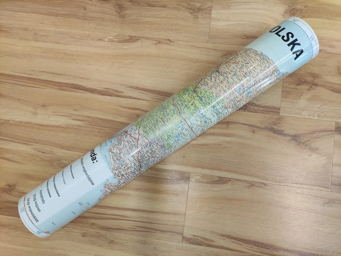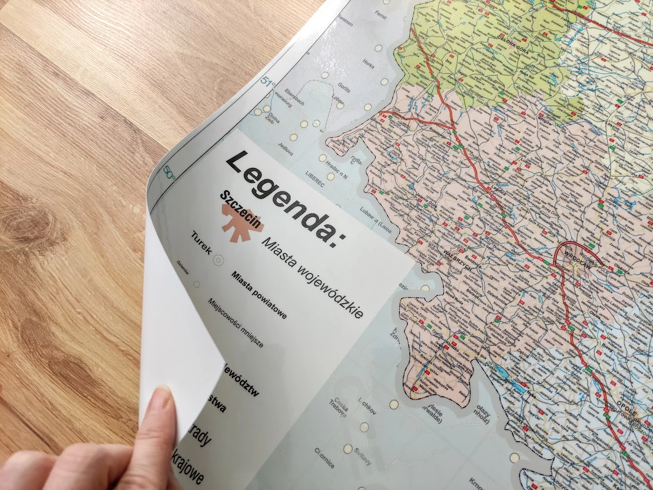 powierzchnia mapy pokryta jest laminatem suchościeralnym - to daje możliwość wielokrotnej zmiany notatek i rysunków jeśli użyjesz markerów suchościeralnych po prostu zetrzyj tekst i napisz od nowa;