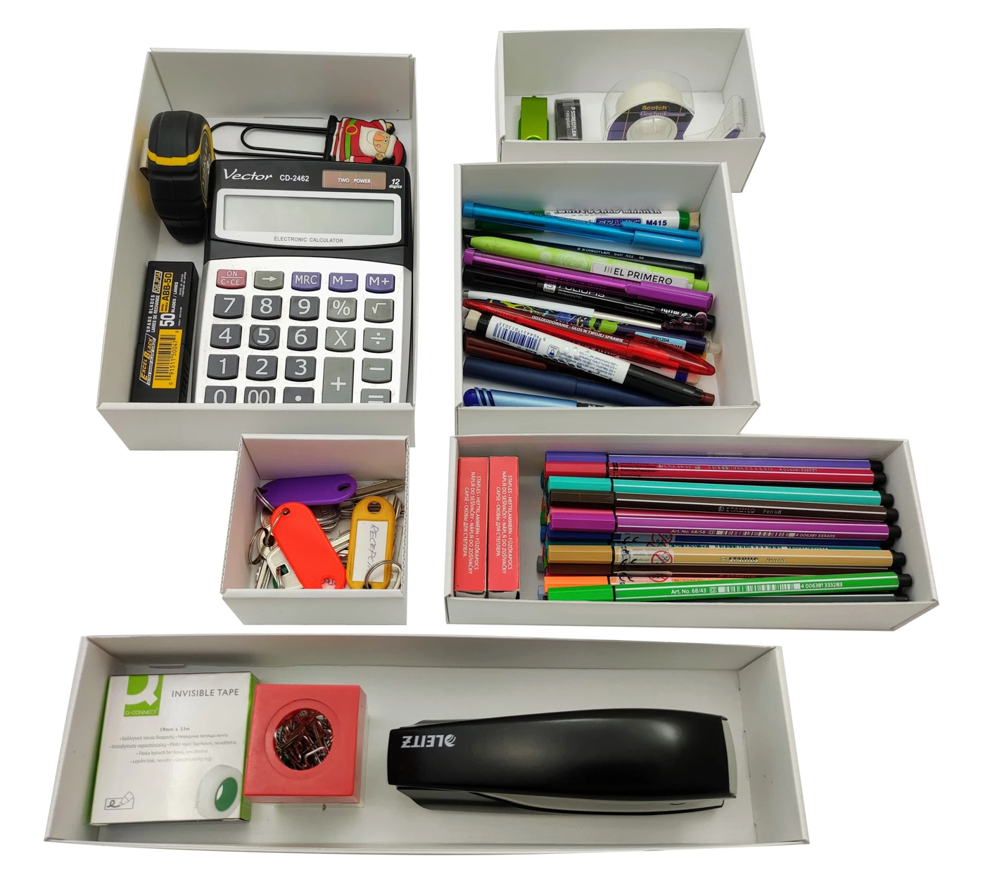 W zestawie znajdują się wkłady do szuflad lub na biurko wielkości: