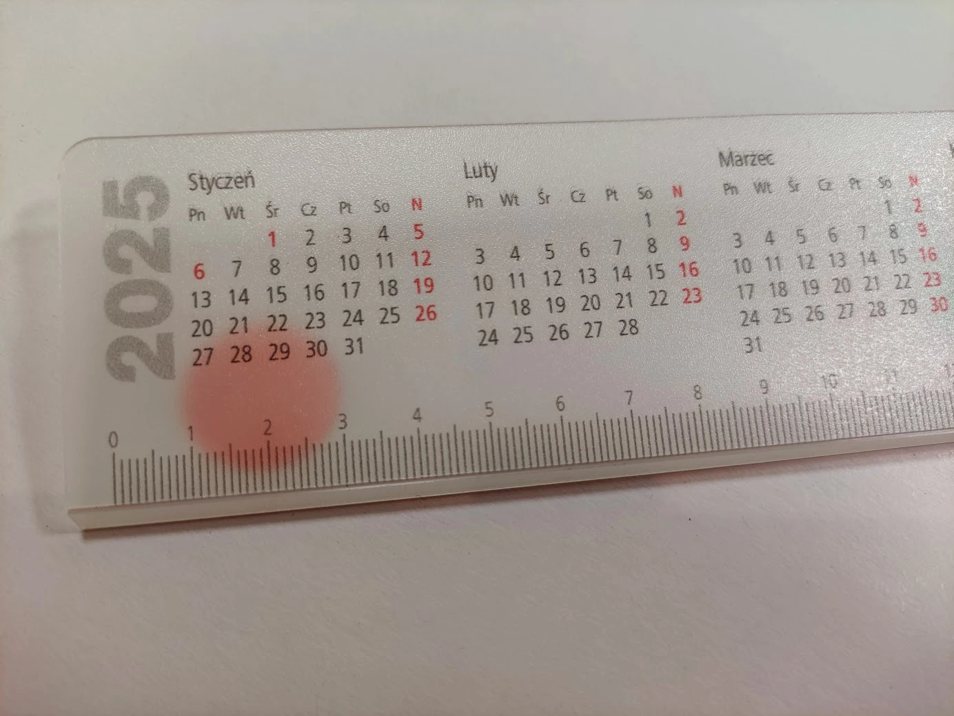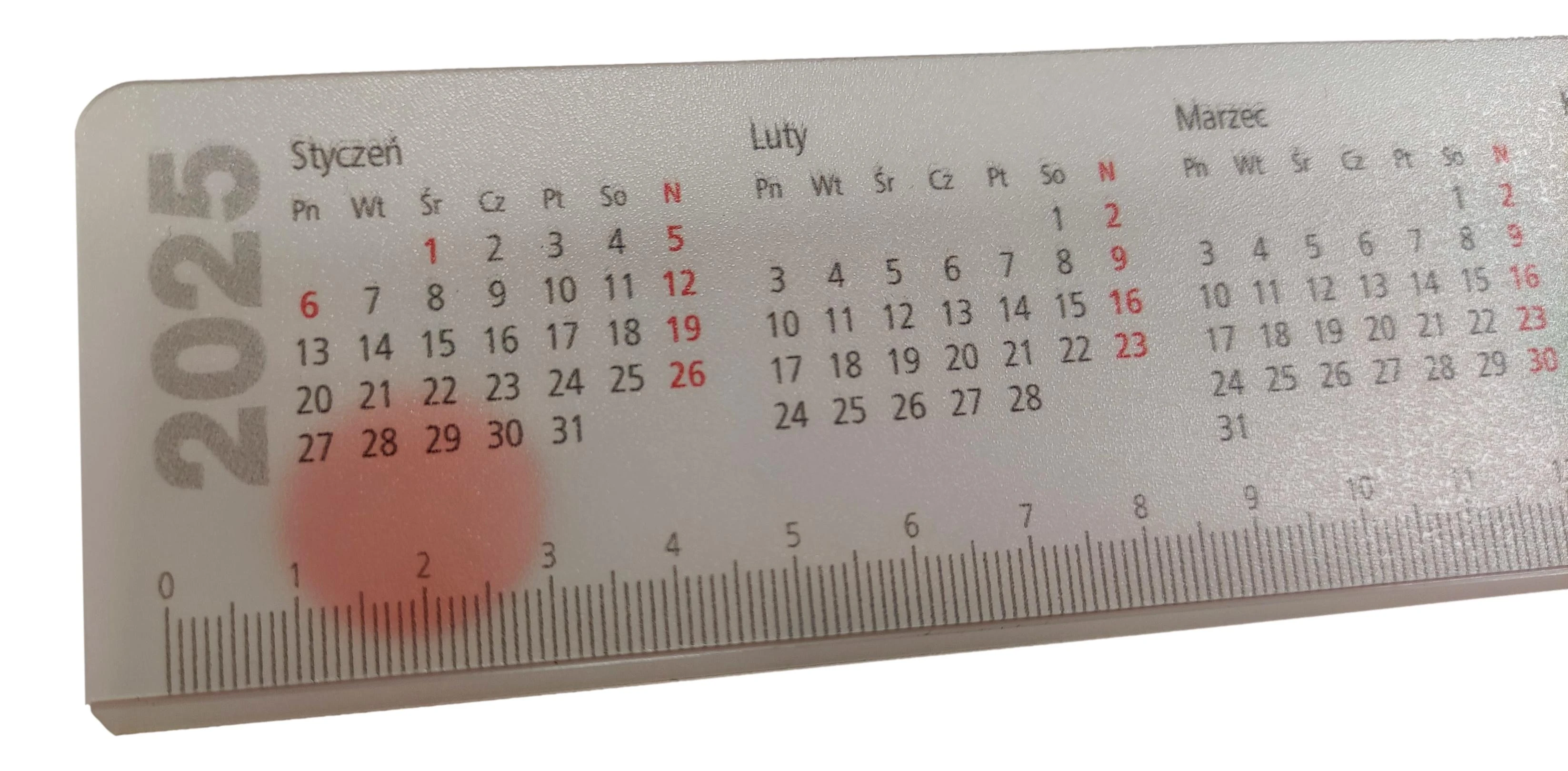 - nadruk skróconego kalendarza na rok 2025 i miarka z milimetrową podziałką.