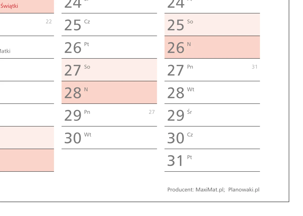 atrakcyjna i przejrzysta kolorystyka: miesiące roku 2025 odróżnione są kolorystycznie od miesięcy przynależnych do roku 2026