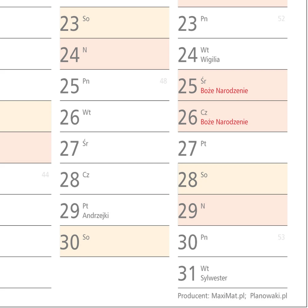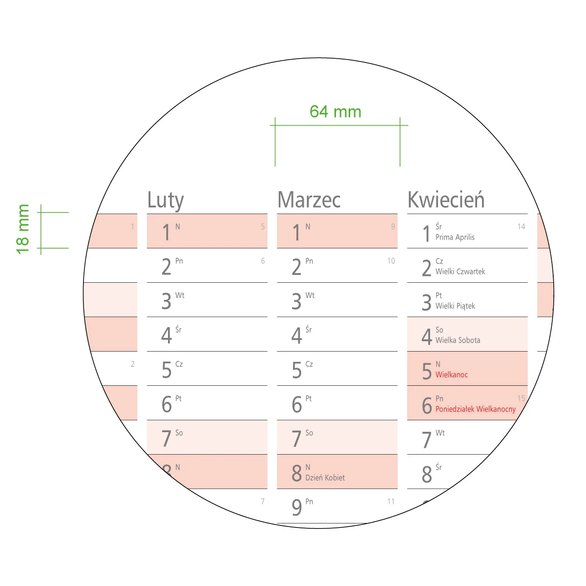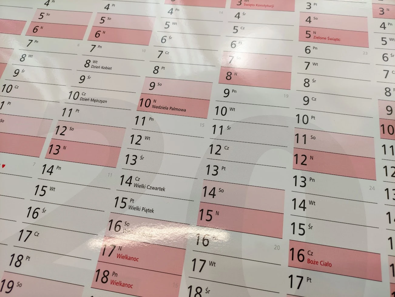 zaznaczone dni wolne od pracy, święta państwowe i kościelne oraz zwyczajowe święta m.in. Dzień Babci i Dziadka, Dzień Kobiet, Dzień Matki, Dzień Dziecka