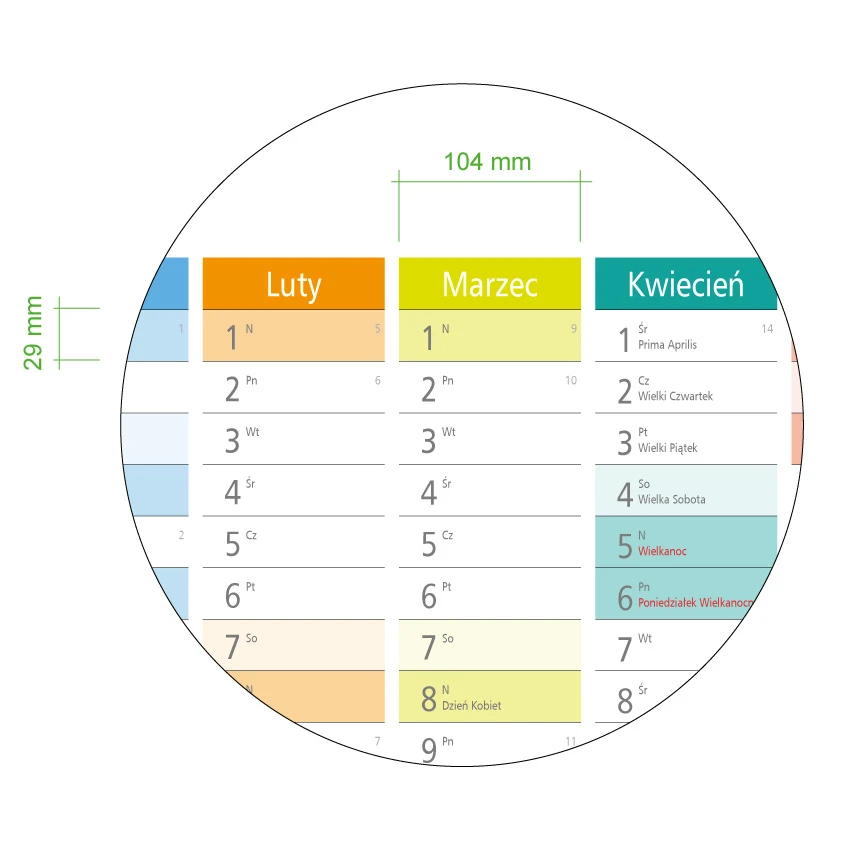 zaznaczone dni wolne od pracy, święta państwowe i kościelne oraz zwyczajowe święta m.in. Dzień Babci i Dziadka, Dzień Kobiet, Dzień Matki, Dzień Dziecka,