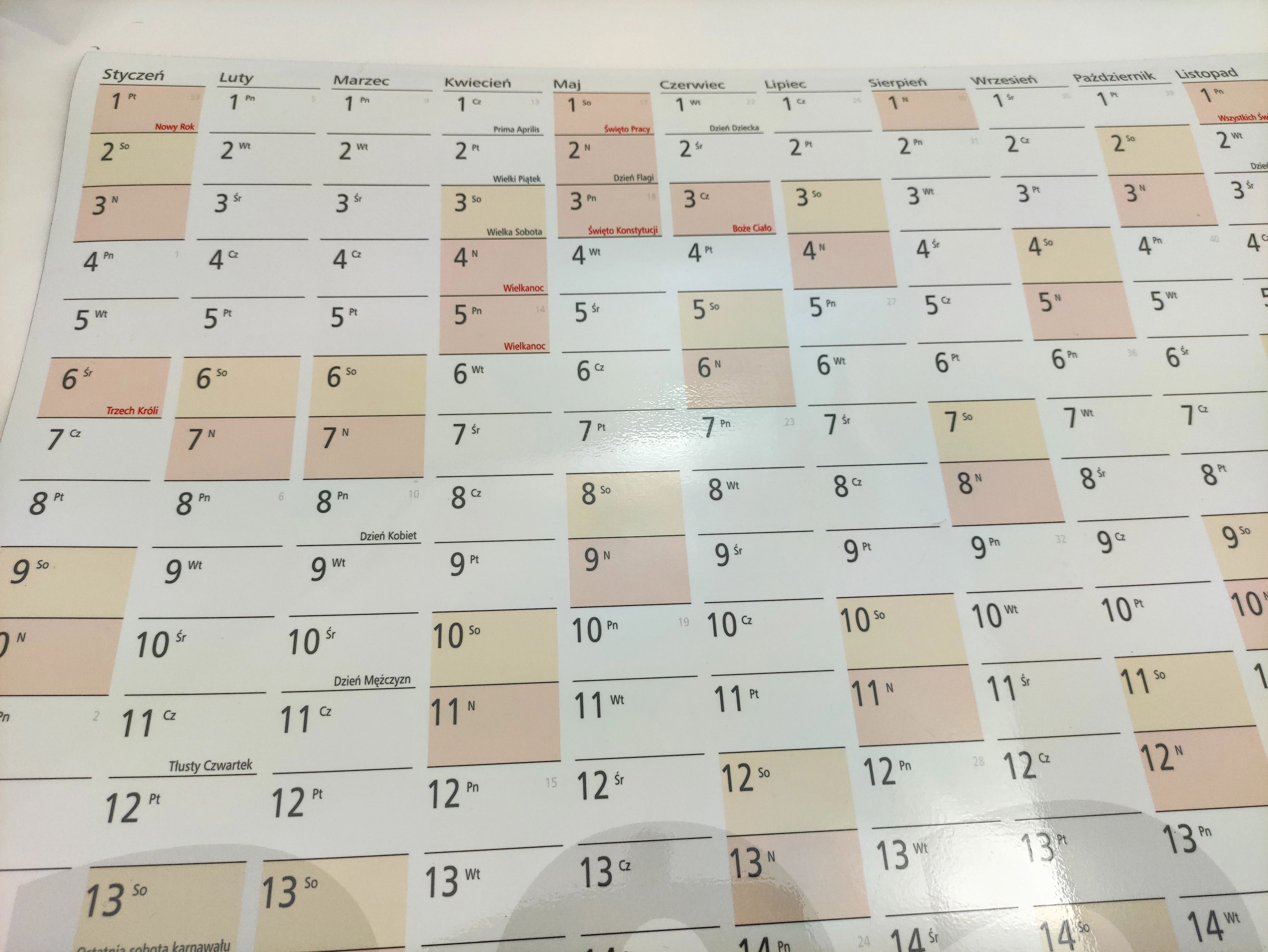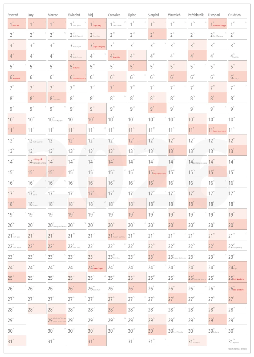 zaznaczone dni wolne od pracy, święta państwowe i kościelne oraz zwyczajowe święta m.in. Dzień Babci i Dziadka, Dzień Kobiet, Dzień Matki, Dzień Dziecka.