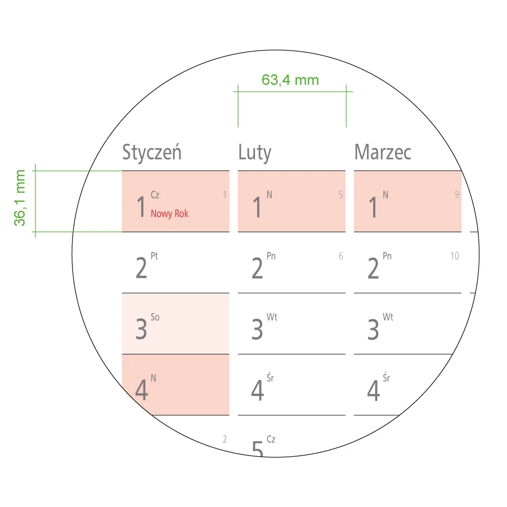 przy każdym dniu pole na notatki wielkości szer: 63,4x36,1mm