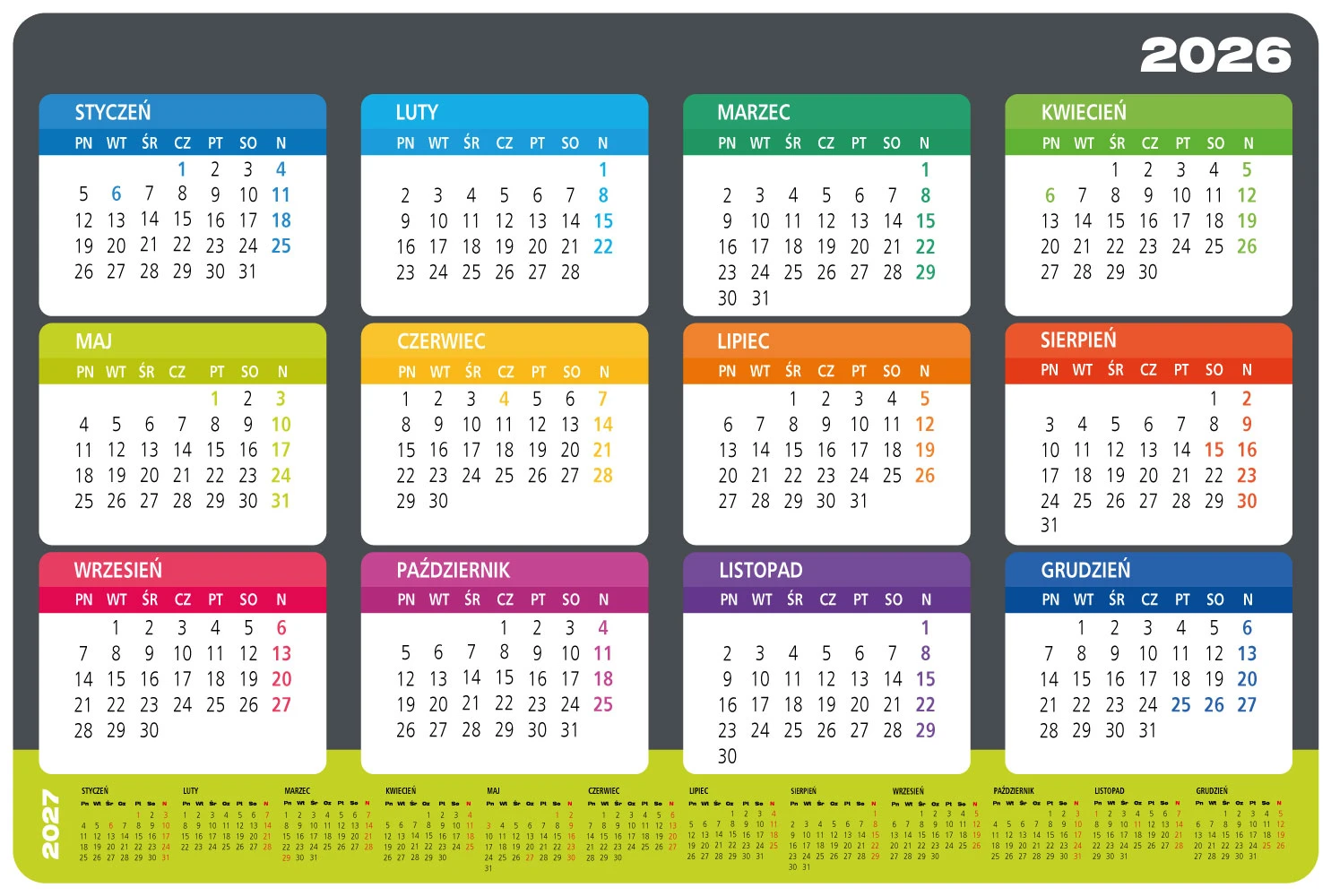 Grafika: kolorowy kalendarz ścienny 2026 w wersji poziomej + dodatkowy kalendarz 2027 u dołu